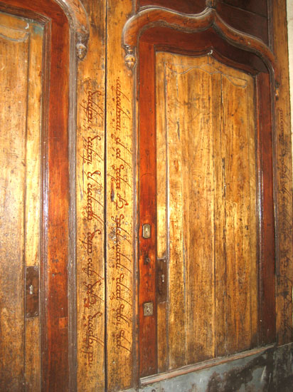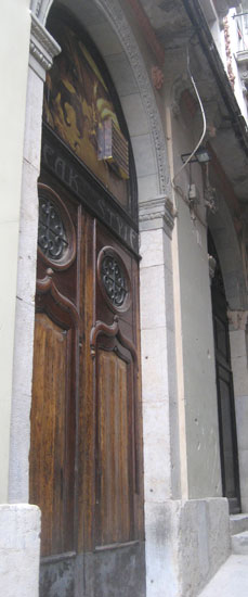 This door in the old Jewish center of Girona was on a cobblestone street so narrow it wasn't possible to photograph the entire door straight-on. At left, a glimpse of the door's graceful lines. At right, a close-up of the woodwork and the writing engraved in the panels. | ![]() |