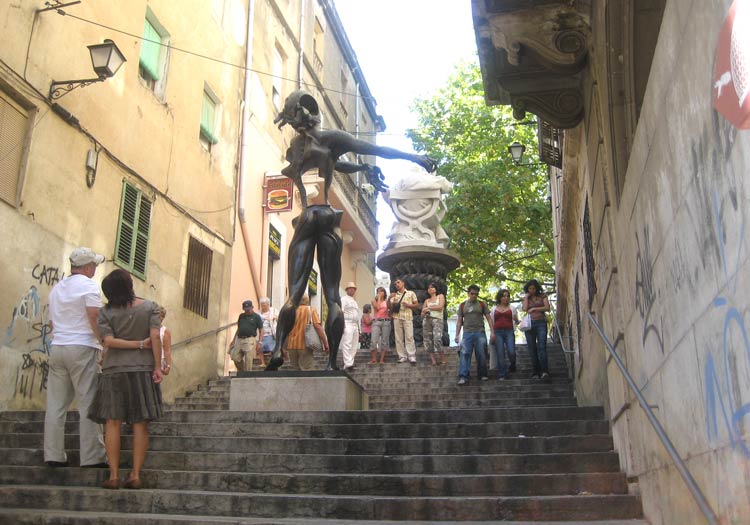 One day, we take a trip to the town of Figueres, where the Dali Theatre-Museum sees more visitors per year than any other museum in Spain besides Madrid's El Prado. At left, Cynthia and Sonoma County friend Marilyn - who joined us for our first week in Spain - in front of the museum. |
