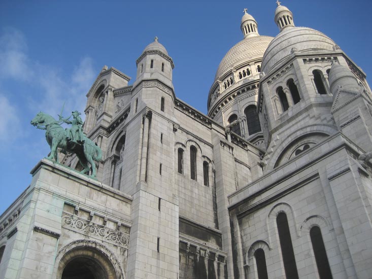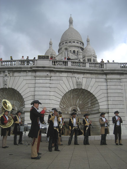 | During an early morning visit to Sacre Coeur, we encountered the world's worst band. They looked fabulous -- dressed like vaquero pimps in leather jackets, tight leather chaps, and black hats -- but their sound! Ai yi yi! None of them in key with another, none of them in time with another. Some seemed to be playing a waltz, others a 4/4 beat. It was like listening to 3rd grade band practice. People were fleeing in droves and those who remained were gawking in slack-jawed amazement at the debacle. |