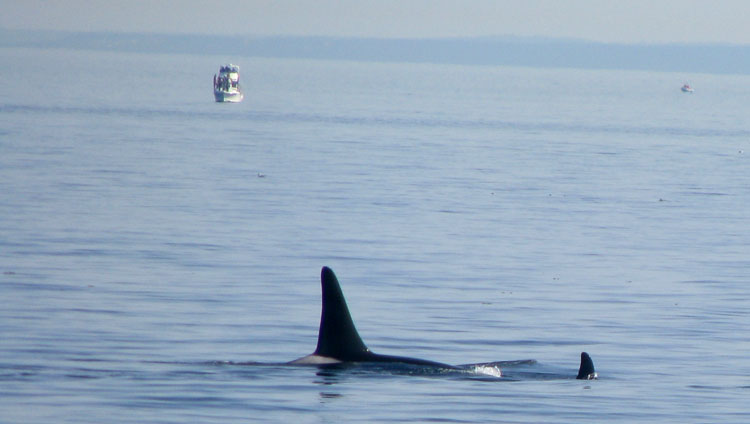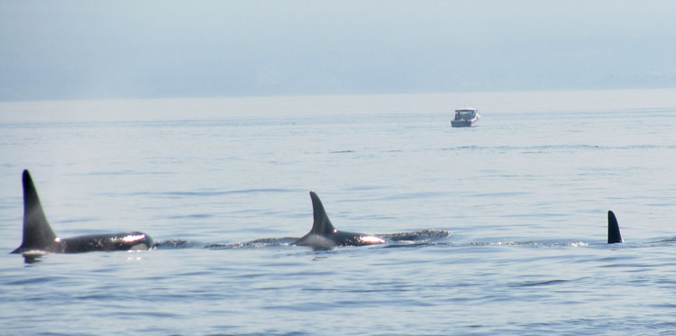Orcas aren't really whales at all, they're extraordinarily large dolphins. There are three families (called "pods") of Orcas living year-round in the seas around Victoria. The pods are given letter names; the three pods currently in residence are J, K, and L. (and yes, there is an I pod, but that group doesn't hang out in the same region). There are also transient Orcas, as well as transient humpback, gray, and minke whales. On our trip we see no true whales, but we observe dozens of resident Orcas.
