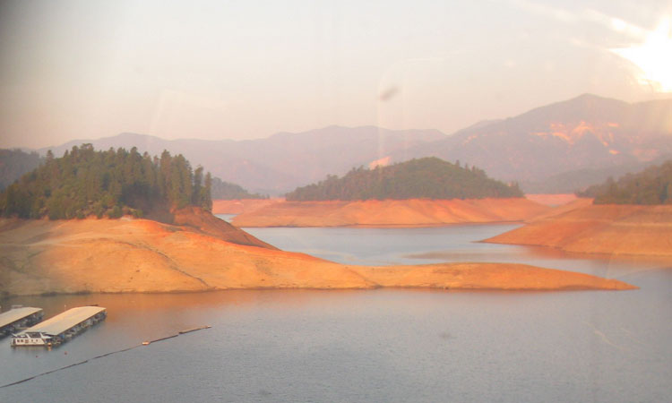Between summer fires and the drought, this dammed lake in the rolling California hills north of Redding is nearly empty.