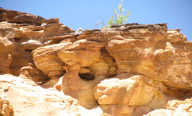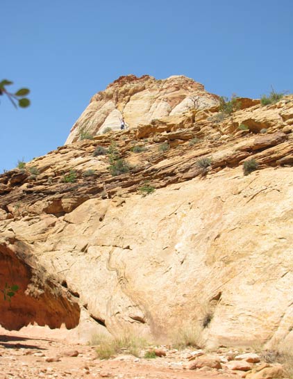 Our first hike in Capitol Reef takes us along a dry sandy river bed with massive cliffs soaring above us on either side. Look closely to see David waving from atop a ridge. |