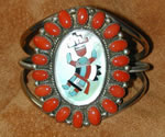 is adorned in turquoise, coral, jet and mother of pearl and sits in