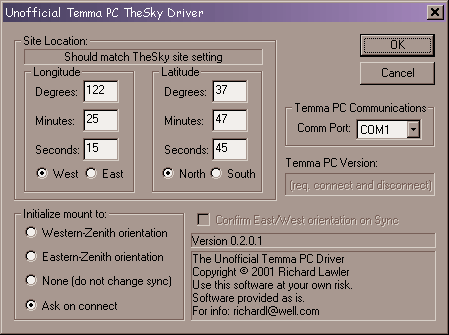 Important Note: Even though the new versions of TheSky V5 include a Temma driver you can still install and use my Unofficial Temma PC Driver on the same system. Then you can use whichever driver suits your needs. The Unoffical Temma PC Driver installs as Telescope API driver so it will be listed in the Telescope Setup menu as "Telescope API". The Software Bisque Temma driver has its own entry in the Telescope Setup menu.