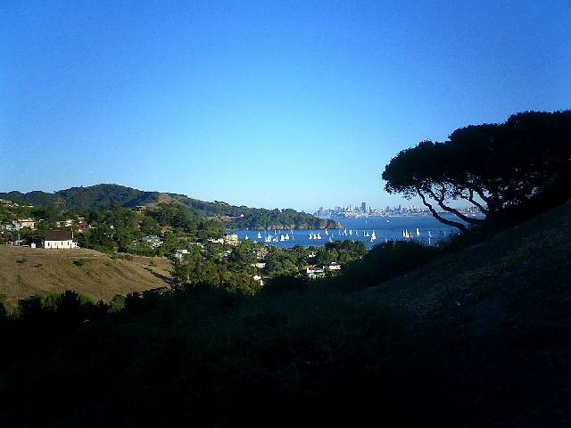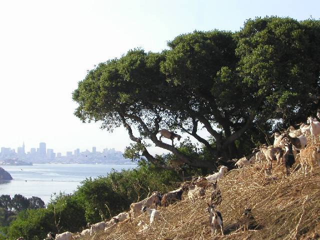 In December 2004, after having been back from Europe for a year, and being over 3 years without a cat, I decided it was time to get a kitten. Well, long story, but that intention converted into two really cute kitties who had been rescued from a woodpile where a coyote had killed their mother. They're now fine, and grown, and living up to their names; Thelma & Louise. Out back got interesting last year. First we did a wild thing; hired GoatsRUs to clean off our overgrown hillside... by munching it down! They did a great job, and finished off by climbing a tree to see if they could find more goodies. We also redesigned the back deck and windows giving us an even greater view of the bay and the city.