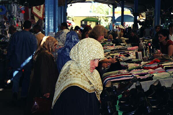 This lady is pondering footwear choices at the Russian Market, Trabzon