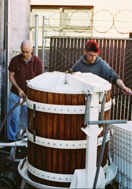 My friend Eric started a small winery, Ladd Cellars, in 2005. He's focussing on Pinot Noir and will also have some Syrah. By small, I mean that his first year's production will be around 175-200 cases of the Pinot, with another 25 or so of the Syrah, if I'm counting correctly (or remembering correctly what he's told me). I helped with both crushing and pressing the Pinot, and took quite a few photos at the first crush and first press. The photos below are all from the press because I'd already had the crush photos developed and printed before realizing it would make sense to get him a set of photos on CD.
