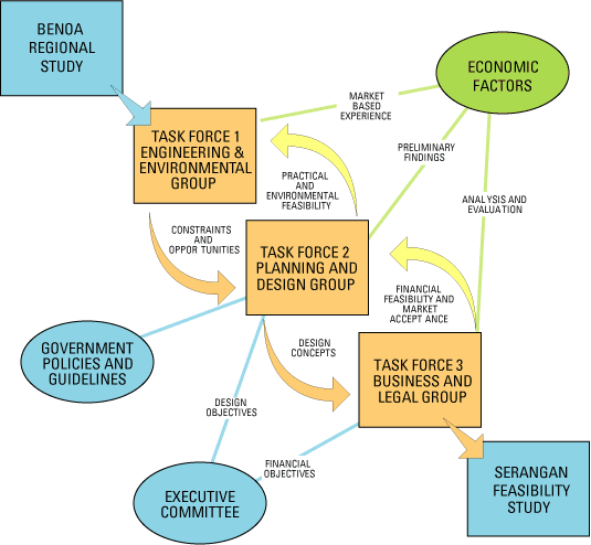 Pre-implementation feasibility was accomplished over a nine-month period The study process was iterative and multi disciplinary involving specialist inputs from over 20 companies based in four countries. Study programs were synchronized with activities of Indonesian university research teams and government agencies. Process and financial management was coordinated via linked computer based reporting systems supervised by project managers based in Perth, Jakarta and Bali. In addition to identifying a number of development opportunities, the study process made clear that significant constraints on development existed from an environmental and engineering point of view Projects initiated and completed upon delivery of the feasibility findings have included: - Extensions and formalisation of Indonesia’s largest urban mangrove national park, - Extensions and infrastructure works on Serangan Island valued at US$ 100 Million