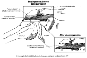 Once these muscles are functioning again, they will hold the shoulder down, and prevent further impingement. The tendon injury will gradually resolve, or settle.Those with more advanced cases generally will come to operative treatment. This includes long standing problems, rotator cuff tears, and cases where the acromion is so large that impingement will clearly continue, unless the bone is trimmed to widen the gap for the tendons.