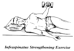 Infraspinatus can be strengthened by lying on the good side, and holding the weight in the upper hand. With the elbow locked at the side and bent up to 90 degrees, the weight is then lifted until the forearm is parallel to the floor. As with the other exercise sets of ten can be performed without ever getting into the are where pain begins.