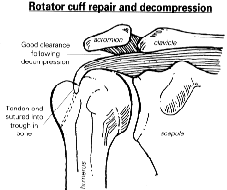 Rotator cuff repair is always preceded be sub-acromial decompression, this being necessary to both remove any damaging spurs and also to increase the space to allow for the repair.Mostly the decompression can be done as an arthroscopic procedure, which is then followed by an open operation to repair the cuff tendons. Whilst this is more complicated than doing the whole procedure open, it has been found that the repair can be done through a split in the deltoid muscle, rather than by having to take that muscle off the bone. This therefore allows for better strength post-operatively, much less pain and earlier motion.