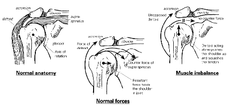 The shoulder, like the hip, is a ball and a socket joint (like a tow bar). Unlike the hip however, the socket is very small and is not big enough to hold the head of the humerus in place. This gives the joint a large range of motion, but as a consequence it also means that it is potentially unstable. To function normally, muscles on both sides of the joint must work together to hold the joint in place during movement. This means that when the deltoid muscle lifts the arm out from the side of the body, the supraspinatus (sounds like asparagus eh?!) and the other muscles of the rotator cuff must pull down on the top of the humerus. This causes a levering out of the humerus with the rotator cuff muscles working in conjunction with the deltoid. The rotator cuff thus prevents the deltoid from driving the humerus up into overhanging acromion. In the normal shoulder, this mechanism is so finely tunes that it always keeps the reaction force of the humerus at right angles to the joint. The joint therefore is always stable......... unless taken unaware.