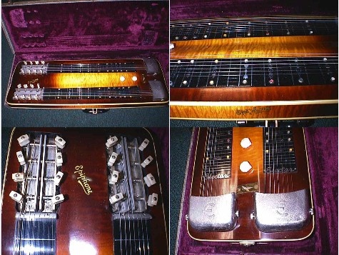 AlkireThe Alkire Eharp (a ten string lap steel) was developed by Eddie Alkire around 1939 in a search for more harmonic possibilities for the lap steel guitar. Alkire Eharps were made by Harmony and Valco. See this link for information on Eddie Alkire and his ten string steel guitars. Here is the eHarp player's web site. BigsbyPaul Bigsby is generally considered to be one of the great steel guitar manufacturers. He's also famous for being one of the first builders of electric solidbody guitars, as well as for the vibrato mechanism seen on Gibson, Gretsch, and many other guitars. His steel guitars were played by Joaquin Murphey, Speedy West, and many other famous guitarists of the day. Most of the guitars I've seen have been double or triple neck guitars, with the name Bigsby prominently displayed on the front of the instrument, usually along with the name of the original owner. CarvinLowell Kiesel started out making steel guitars and amplifiers in San Diego, California immediately after World War II. He renamed his company Carvin (a combination of the names of his two sons, Carson and Gavin) and went on to make a wide variety of guitars, amplifiers, and other musical equipment. Carvin is and was the only sizable guitar maker that sells most of its merchandise through mail order. Carvin made Hawaiian guitars in various combinations, but I haven't seen any information on particular model numbers. DanelectroThese are relatively rare lap steel guitars, although not particularly collectible. If you have any information on their steel guitars, please let me know. DickersonDickerson steels were the precursors of the Magnatone line. Delbert J. Dickerson began manufacturing guitars in the 1930s. At the height of the company's manufacturing career they were building 200 guitars a week under 10 different brands, including Varsity, Southern California Music Company, Oahu, Bronson, and Roland Ball (father of Ernie Ball). The patent rights were sold to Gaston Factor in 1944, who later sold the rights to Magna Electronics. Apparently Sol Ho'opi'i was an endorser of the Dickerson line. The cover of the book "The Hawaiian Steel Guitar" is an artist's rendition of Sol holding a National. Inside the book is the real photo, with Sol holding a Dickerson. Dobro/RegalThe term "Dobro®" is a registered trademark, but is also commonly used to refer to any resophonic guitar. Dobros have been made since the 1920's. A discussion of the history of the Dobro Company can be found on their web site. Dobro electric lap steel guitars were manufactured from 1935 to 1943. Models offered included metalbody and woodbody electric Hawaiian guitars. EpiphoneEpiphone started making electric steel guitars in 1936. The models offered included: