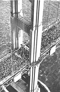 Hundreds of thousands of revelers flattened the arch of the Golden Gate Bridge on its 50th anniversary,