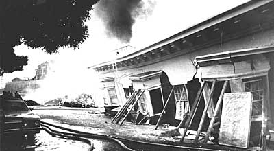 The 7.1 Loma Prieta earthquake devastates parts of Northern California, including this Marina District apartment building once four stories tall. 63 are dead.