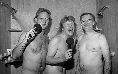 Campaigning Mayor Frank Jordan, right, on a dare jumped naked into the shower at his home with KRQR disc jockeys Mark Thompson, left, and Brian Phelps, center