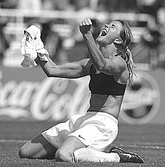 San Jose native Brandi Chastain doffs her shirt and creates a sensation after kicking the U.S. team to Women's World Cup Soccer championship. July 11, 1999